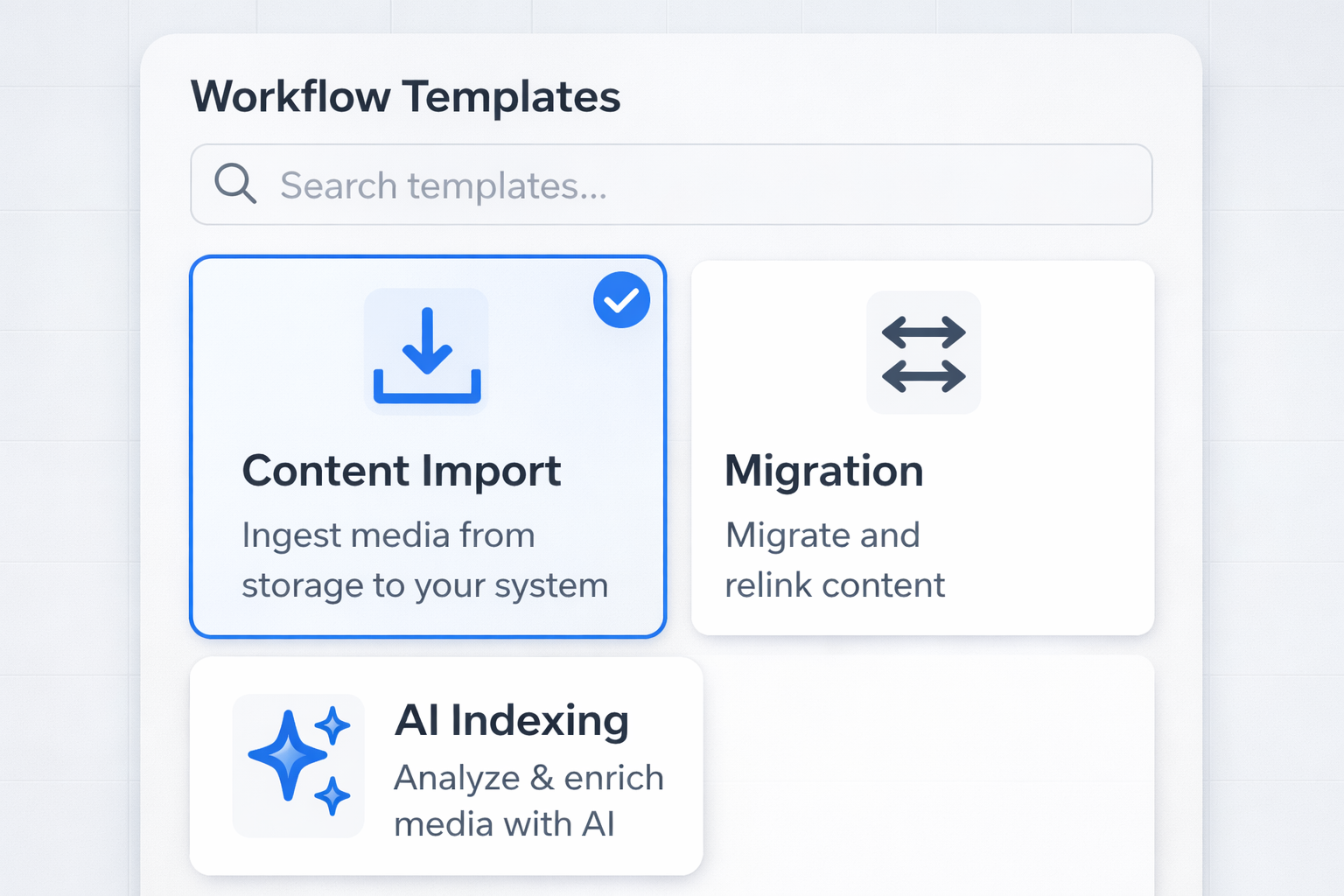 Choose from a growing library of templates for common use cases including content import, migration, replication, provisioning and AI indexing.Each template contains the full workflow logic — ready to run.